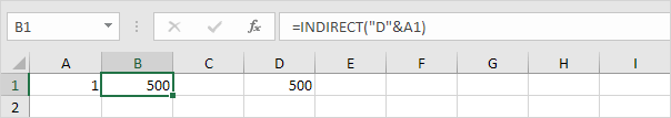 Giải thích: = INDIRECT (A1) đổi thành = INDIRECT ("D1"). Hàm INDIRECT chuyển đổi chuỗi văn bản "D1" thành tham chiếu ô hợp lệ. Nói cách khác, = INDIRECT ("D1") giảm xuống = D1.